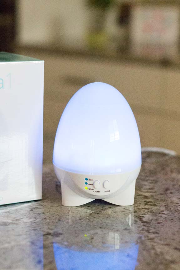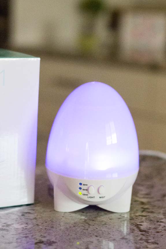 They are really easy to use. Fill it up with water until you reach the line, drop in a few drops of your favorite essential oil, close the top, then turn it on! There are a lot of different colors that it will rotate through, or you can leave the light off, and it has a timer option so you can choose how long you want it to run. It’s a great way to help scent your home without having all of the nasty chemicals that apparently candles have. I just found that out and was kind of bummed until I realized that I can just use a diffuser!