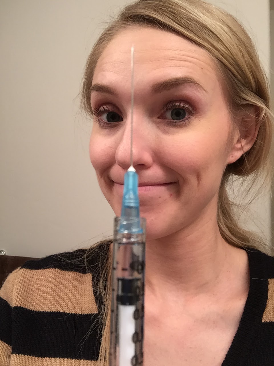 Last night’s photo that I sent to the family. With the shot. On the wrong day. This is probably my best picture yet. Bags under my eyes…didn’t really do my hair yesterday. Vogue? Do you want this?
