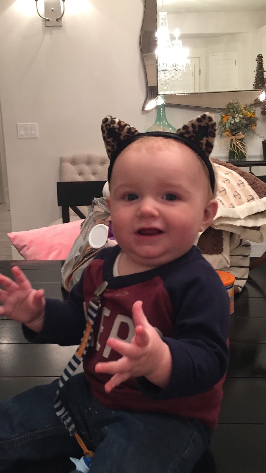 I watched my little 3-year-old niece Sloane and 6 month-old-old nephew Finn last night. We had to try the cat ears on Finn. He practically asked me to do put them on him.