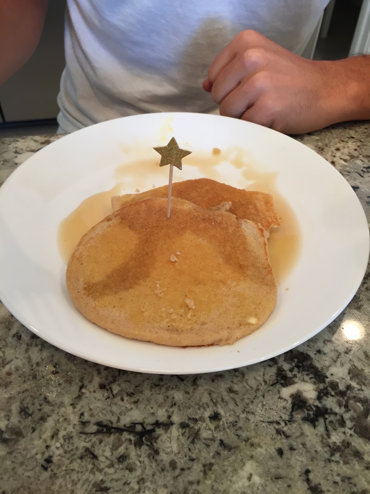 My sister-in-law Rachel sent me this photo of Tyler and I after my niece Isla’s baby blessing and I sure like that guy. I was making pancakes on Sunday while also making cupcakes for my lesson at church and he didn’t want to feel left out (he can’t eat the cupcakes in our healthy eating challenge) so he put one of the star toppers on his pancakes. I think it makes them look much more delicious!