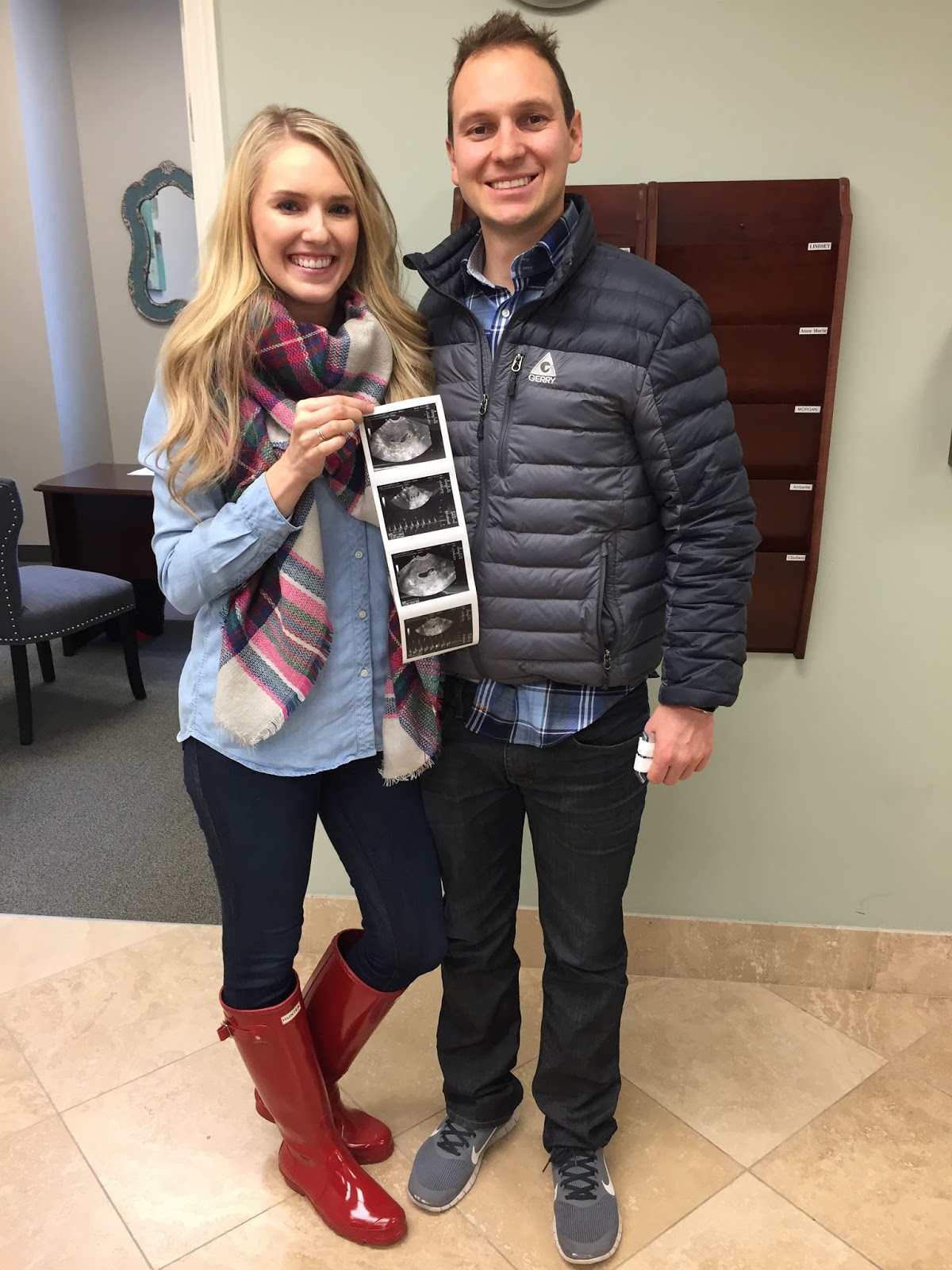 We were about 10 minutes early to our appointment so we signed in and sat in the waiting room. When we were called back, the nurse asked me if I needed to “empty my bladder” and I said no, then wondered if I should have said yes because I forgot if it was best to have an empty or full bladder for an ultrasound. I undressed from the waist down and Ashley (my ultrasound tech and friend), popped her head in the room and said, “I can’t wait any longer!” joking with us. She used an intravaginal ultrasound as they always do there, and she saw that my bladder was full. I asked her if she wanted me to go use the restroom but she said she couldn’t wait any longer to find out. Your dad walked down by her and she started to smile really big. Your dad’s head was blocking the screen but I could see it a little bit and I thought I saw twins. I had googled what twins look like in the uterus (of course ;)) but he hadn’t and she was looking at him expecting him to see it. She said, “I’m just looking at the twins” and I screamed so loud!! Another nurse came in and said, “Is it twins? I called it!”